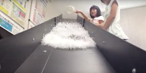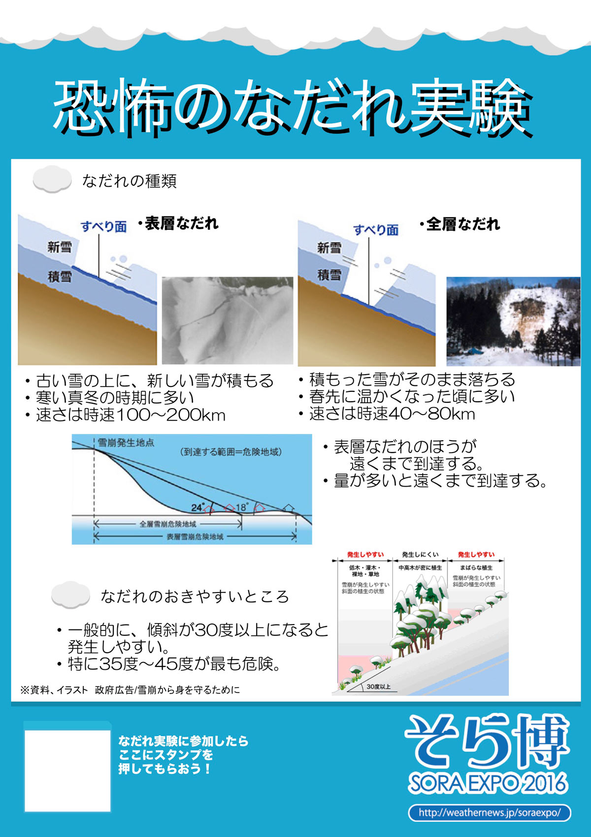 斜面に量の違う発泡スチロールのビーズを流すことで、擬似的に雪崩の仕組みを観察してもらいます。また、同時に雪崩の危険さについても解説します。