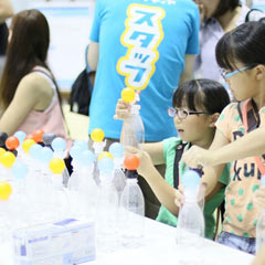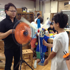 熟練気象予報士によるお天気実験。台風の吸い上げ効果を体験したり、台風レベルの風を起こすチャレンジをしてもらいます。また、台風吸い上げ装置の工作も行います。