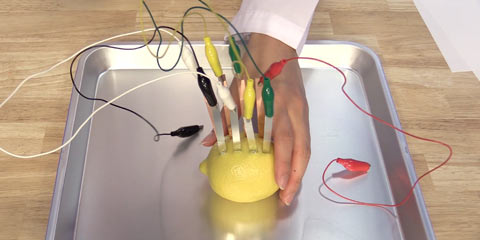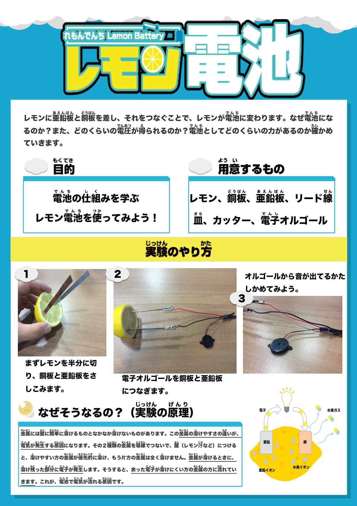 レモンに亜鉛板と銅板を差し、それをつなぐことで、レモンが電池に変わります。なぜ電池になるのか? また、どのくらいの電圧が得られるのか? 電池としてどのくらいの力があるのか確かめていきます。