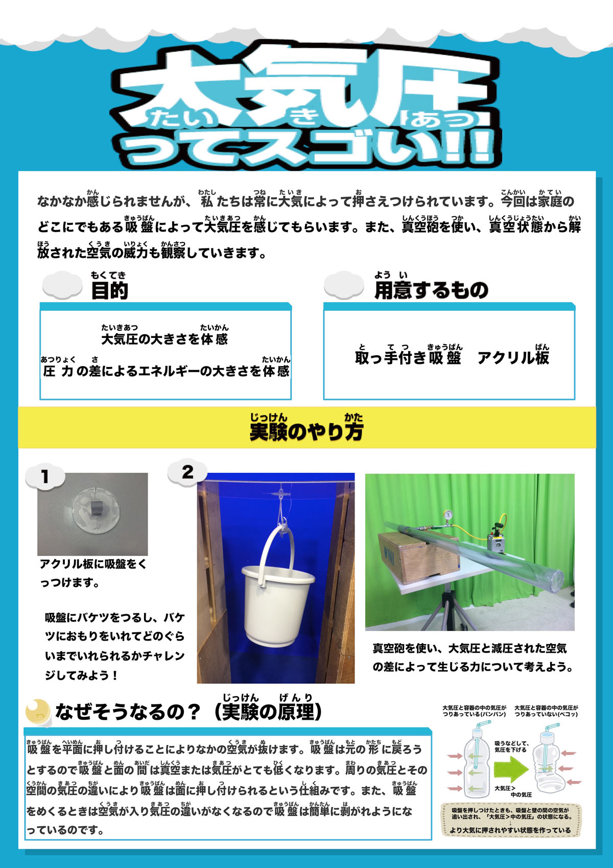 なかなか感じられませんが、私たちは常に大気によって押さえつけられています。今回は家庭のどこにでもある吸盤によって大気圧を感じてもらいます。また、真空砲を使い、真空状態から解放された空気の威力も観察していきます(※真空砲はステージのみ)。
