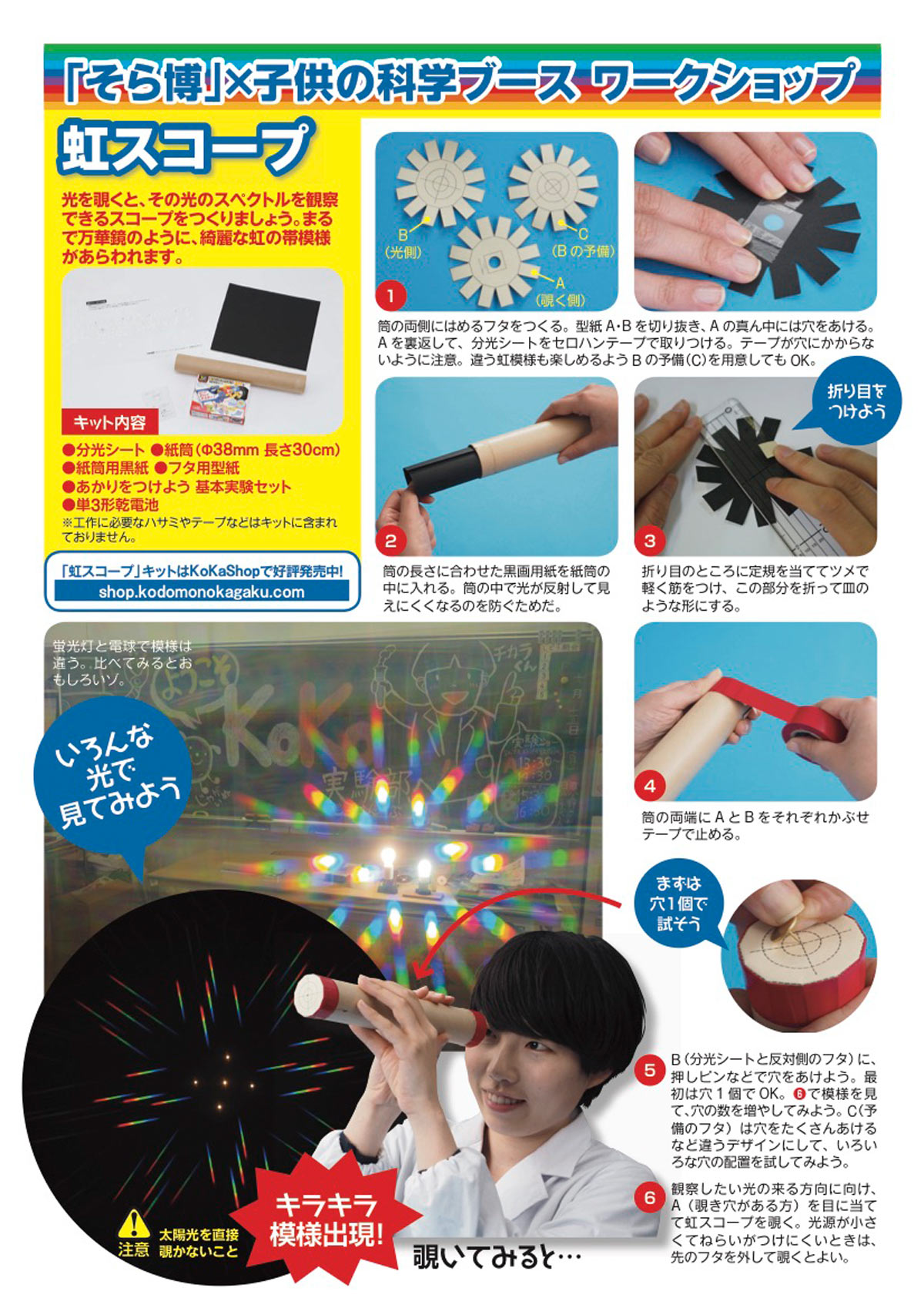雑誌「子供の科学」の中で紹介された実験・工作を行っていきます。今回は「虹色スコープ」と「何でもグラス」を実施。どちらも光の性質を学べる実験・工作です。ご参加下さい。7日日曜日は「子供の科学」ではおなじみの「でぼにあん先生」も参戦します!