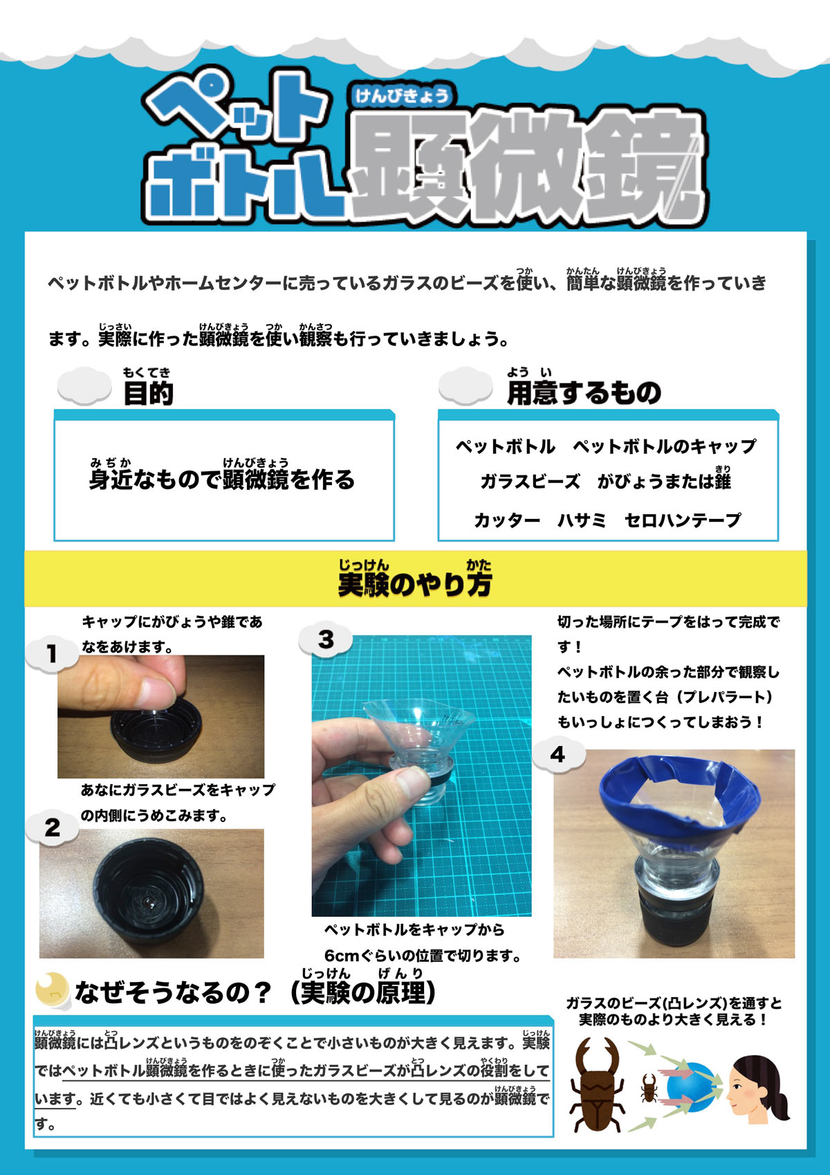 ペットボトルやホームセンターに売っているガラスのビーズを使い、簡単な顕微鏡を作っていきます。実際に作った顕微鏡を使い観察も行っていきましょう。