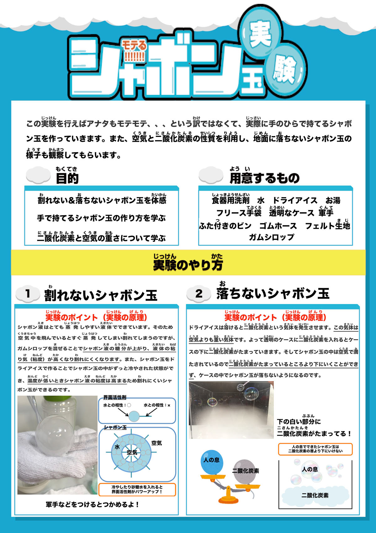 この実験を行えばアナタもモテモテ、、、というわけではなくて、実際に手のひらで持てるシャボン玉を作っていきます。また、空気と二酸化炭素の性質を利用し、地面に落ちないシャボン玉の様子も観察してもらいます。
