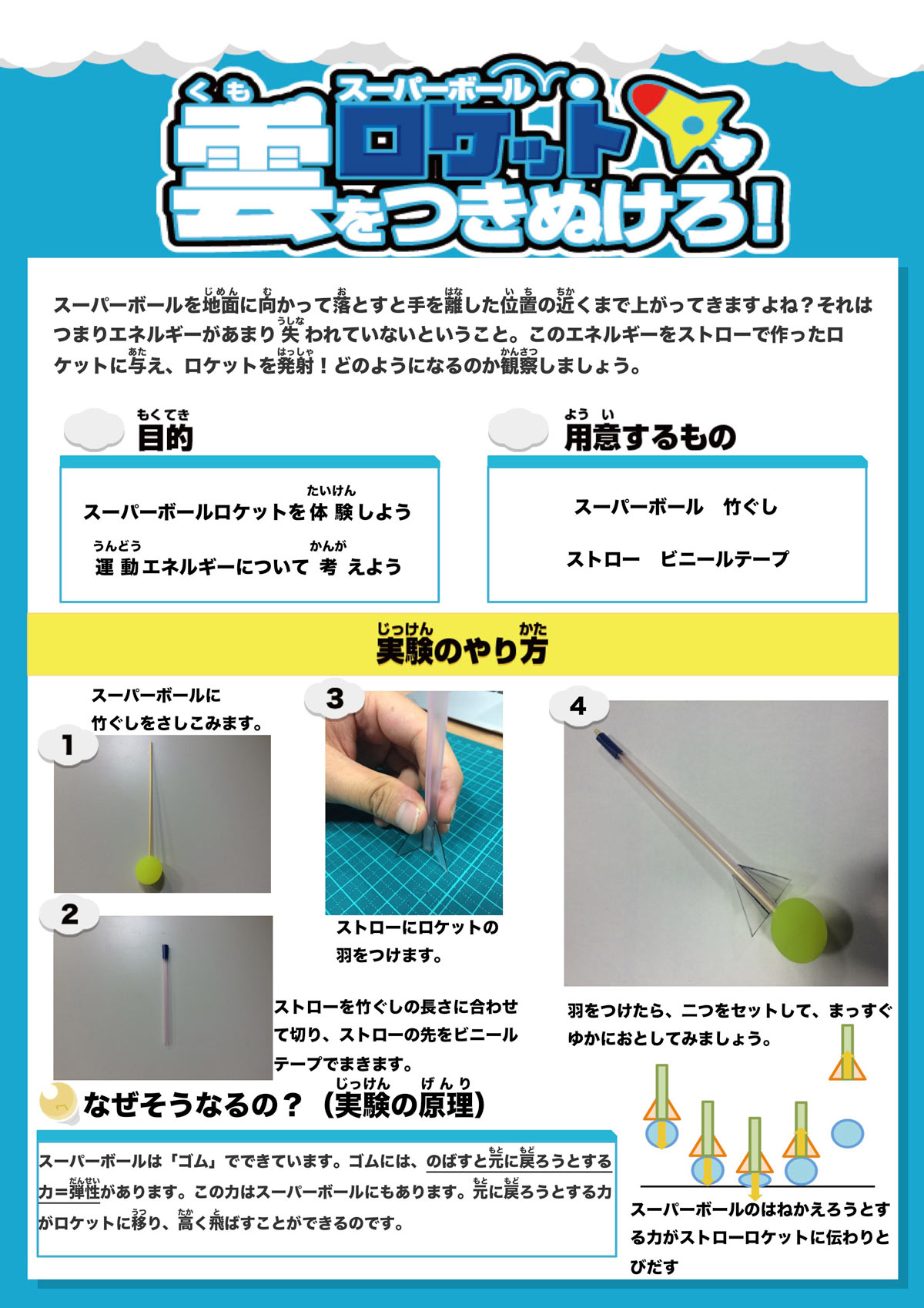 スーパーボールを地面に向かって落とすと手を離した位置の近くまで上がってきますよね? それはつまりエネルギーがあまり失われていないということ。このエネルギーをストローで作ったロケットに与え、ロケットを発射!どのようになるのか観察しましょう。