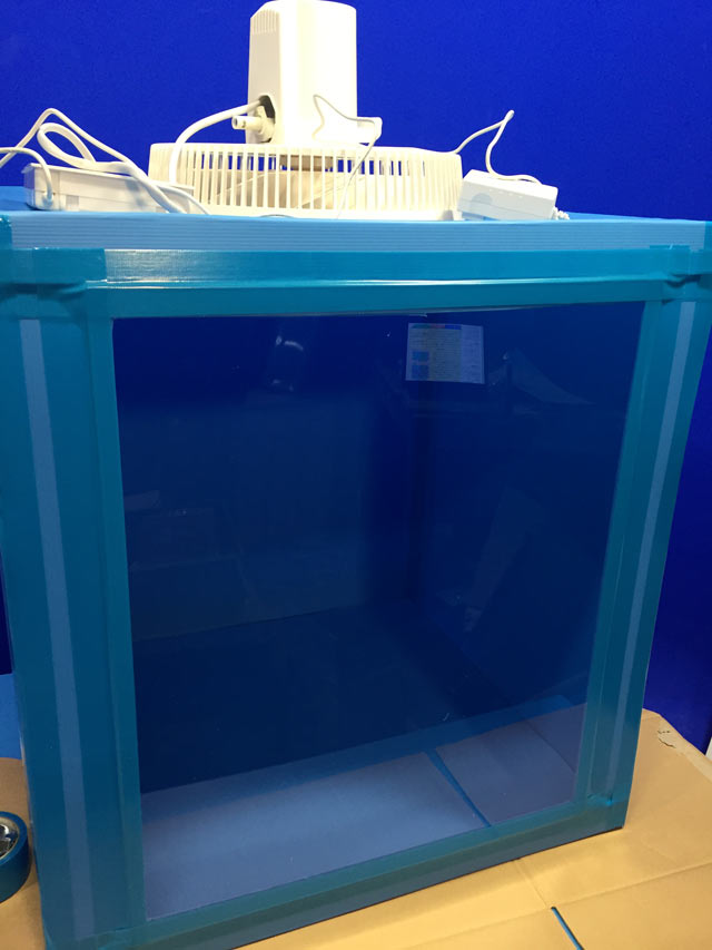 今回の実験では、逆回転の扇風機とドライアイス、段ボールを使い、トルネードを再現しました。