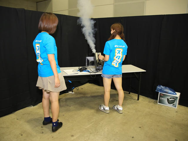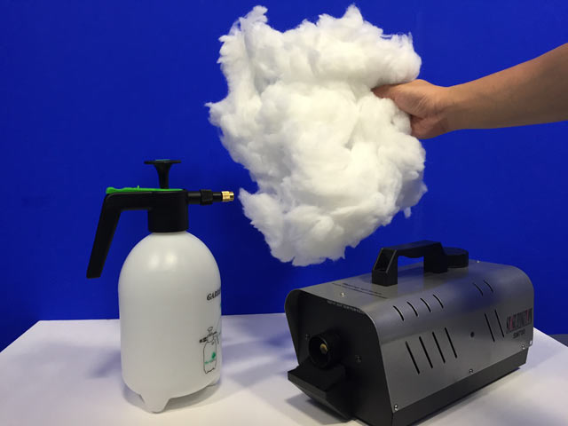霧吹きを使い霧を発生させ、そこにフォグマシンという、霧吹きよりも細かい霧を発生させる装置を吹きかけることで、よりハッキリとした霧=雲をつくりだします。つくりだした雲は上手くいけば霧散することなくフワフワととどまります。今こそシャッターチャンスw