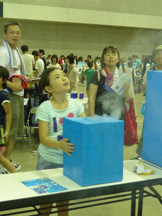 台風は暖かい空気が上昇し上空で水になるときに出てくるエネルギーで発達します。その様子をドライアイスと掃除機で再現します。ただ、それだけですと台風の中心に吹き込む風が再現でいないので、ペットボトルの下に切り込みを入れ掃除機で吸い上げることで、この風をつくりだします。