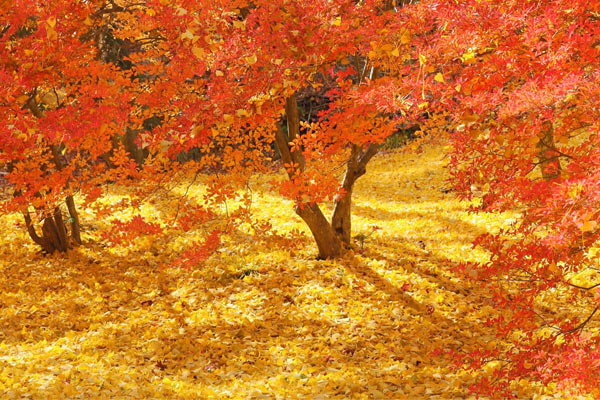 「しばらく行けずにいたらオハツキイチョウはすっかり葉を落としていました。金色の絨毯に秋の光が注ぎます」