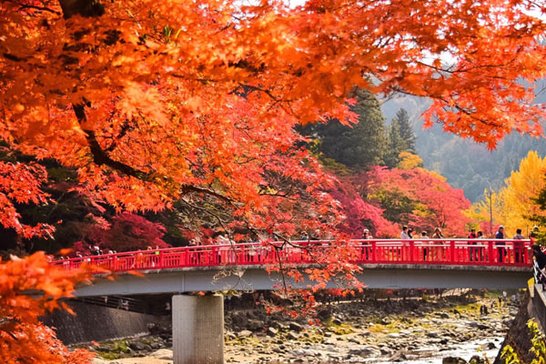 「香嵐渓(こうらんけい)のシンボル的な待月橋(たいげつきょう)はどこから撮っても絵になります」