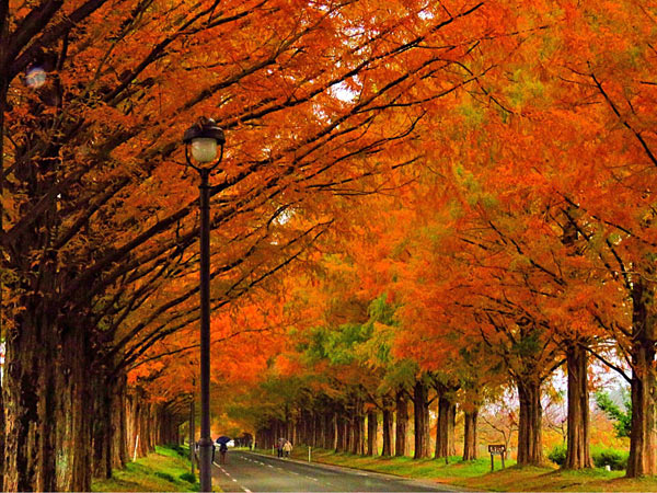 「午前10時くらいのメタセコイア並木道です。昼頃は人と車でごった返していて撮影どころではありません」