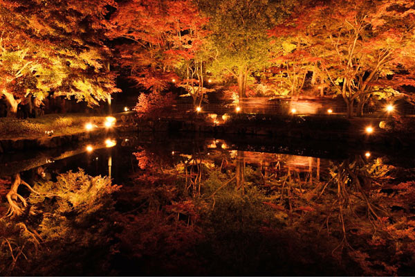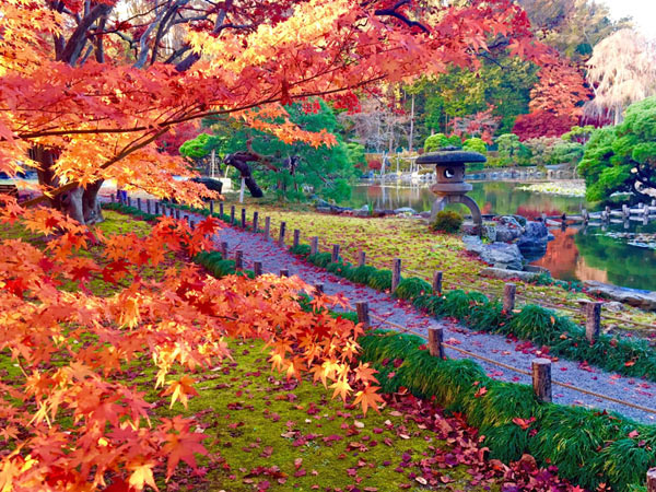 「夕陽に照らされてキラキラ光るもみじの葉っぱ。いつもしっとり落ち着いた雰囲気の庭園もこの時季は色とりどりに華やいでいます」