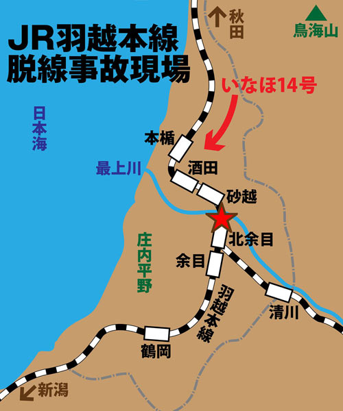 JR東日本の羽越本線は、秋田-新潟間を走る幹線だ。2005年12月25日の夜、秋田発新潟行きの上り特急「いなほ14号」(6両編成)が途中停車駅の酒田(山形県)を出発したのは、定刻より約68分遅れの19時08分だった。